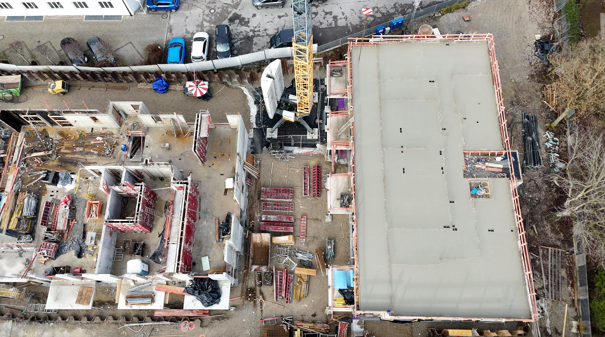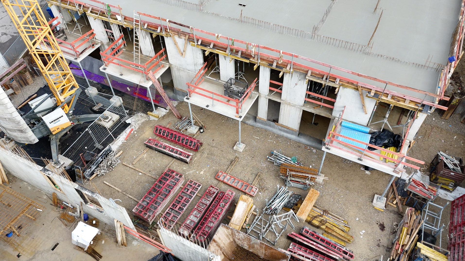 Im September wurde die Abdichtung der Tiefgarage von Haus 3 abgeschlossen, die Untergeschosse von Haus 2 und 3 fertiggestellt und ein zusätzlicher Hochbaukran vom Typ 81K aufgestellt. Damit können die Arbeiten auf dem engen Baufeld noch präziser koordiniert werden – eine wichtige Voraussetzung für die nächsten Bauabschnitte.
