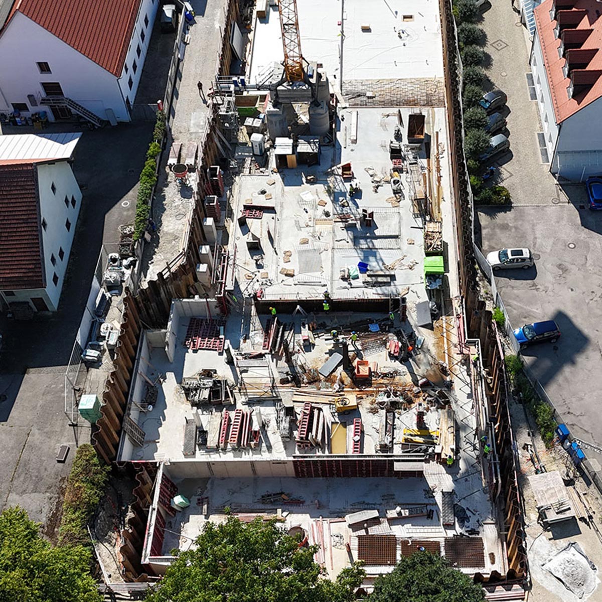 Im Juli wurden entscheidende Bauphasen abgeschlossen: Die Mikropfahlgründung (GEWI-Pfähle) zur Auftriebssicherung der Tiefgarage wurde erfolgreich umgesetzt. Der Aushub der Baugrube ist abgeschlossen, das Planum für alle drei Häuser vorbereitet. In Haus 1 und 2 liegt bereits die Sauberkeitsschicht, in Haus 3 wurde die Frischbetonverbundfolie verlegt. Die Bewehrungsarbeiten für die Bodenplatte laufen, während die ersten Untergeschosswände vorbereitet werden. Die erste große Betonage steht unmittelbar bevor – sichtbarer Fortschritt, der das Projekt weiter wachsen lässt.